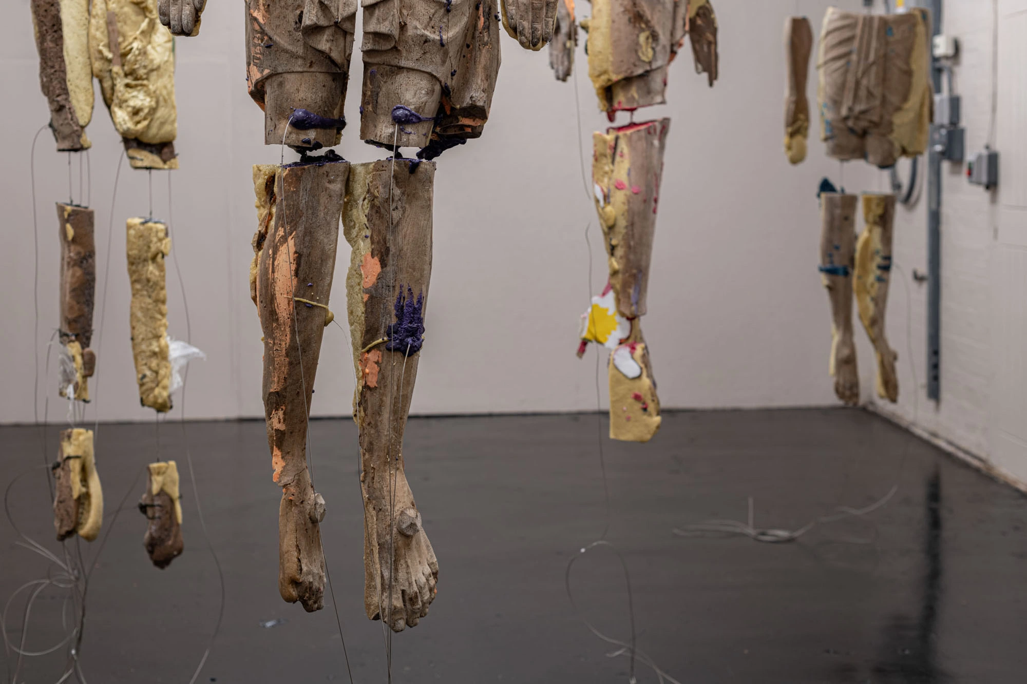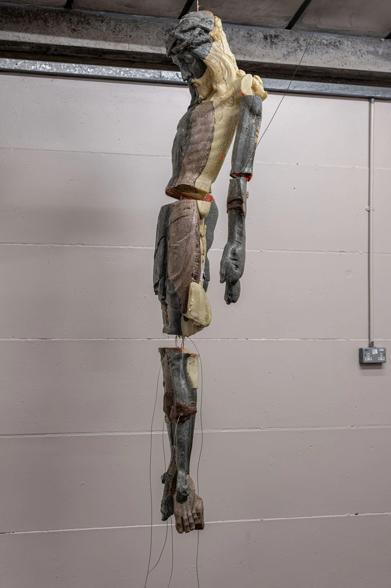 In this space, de Jong’s practice becomes less about provocation and more about witnessing. The figures appear animated yet lifeless, dangling as if awaiting resurrection or disposal. Their material fragility—the soft foam mimicking rotting wood or mummified skin—echoes a world where sanctity has become synthetic. The industrial setting of St. Chads, with its cold lighting and exposed beams, sharpens this sense of posthuman liturgy.