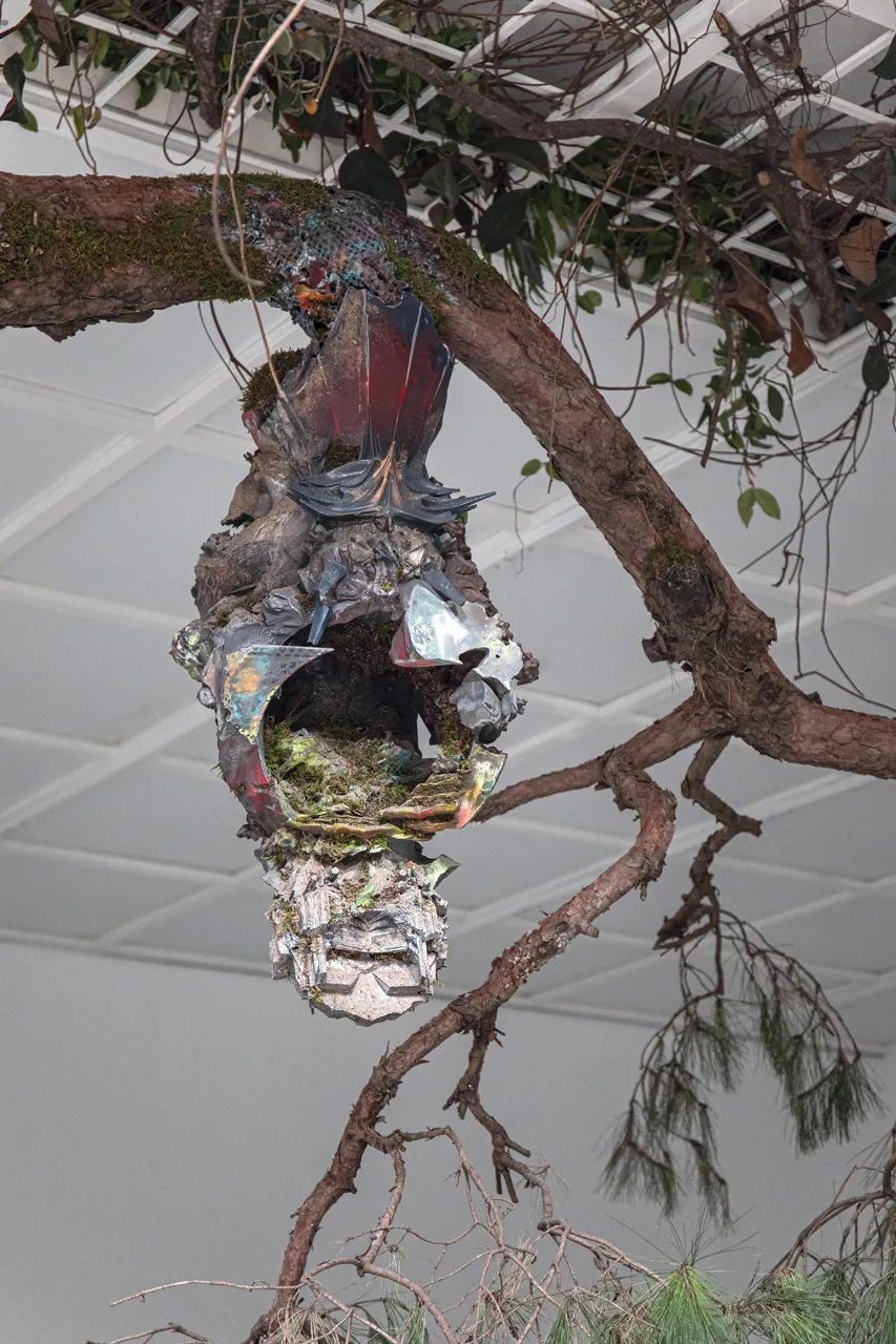 The sculptures feel like emissaries of this transition: machines that no longer perform tasks, tools decoupled from use, fragments haunted by extinct purposes. The washing machine—nestled in the center of a creature erupting in mechanical limbs—reads less as appliance than altar. Watermelons dot the terrain like absurd offerings. Industrial waste dangles from vines in suspended animation. In one moment, the future appears fungal and feral; in the next, brutalist and synthetic. Yet it never resolves—it only accumulates.