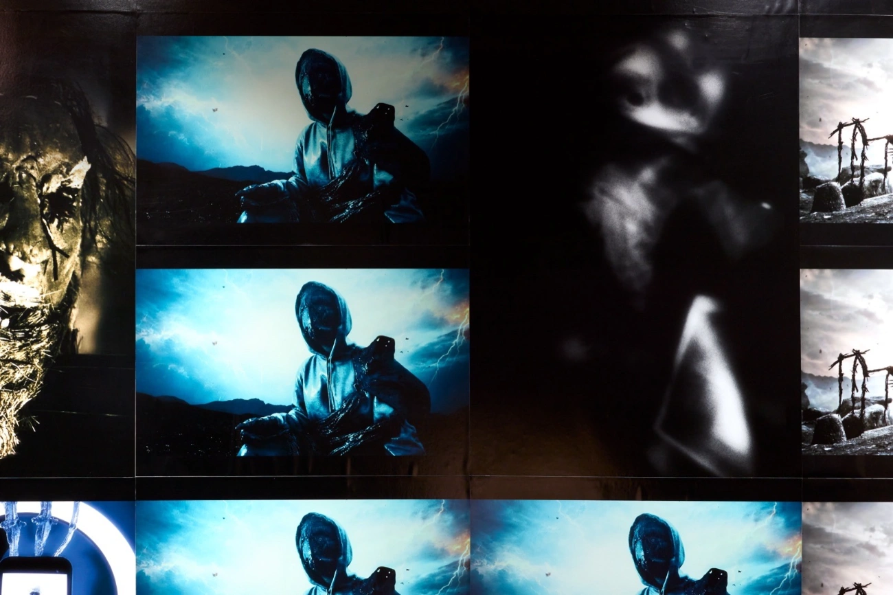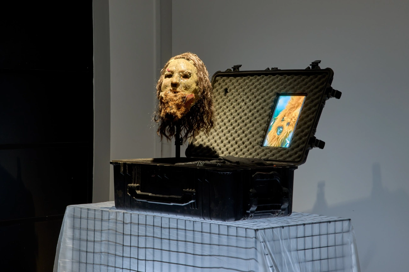 Within the installation, fragments of this fevered ecology materialize: a mannequin slumped on a couch, face replaced by a jittering mechanical jaw; a coffin holding a fox-masked figure suspended between satire and sacrifice; panels of glitched iconography lining the walls like devotional screens for a digital monastic order. Everything is half-real, half-rendered, refusing the security of full embodiment. It mirrors the film’s “model collapse,” in which AI systems, trained on synthetic data, begin producing reality by hallucinating it.