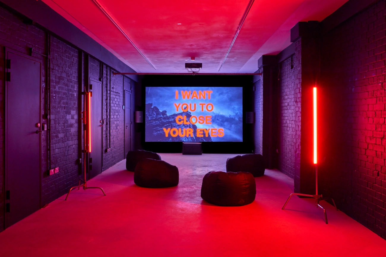 Walking into the installation feels like stepping into a bunker converted into a livestream studio by a cult with no clear doctrine. Screens alternate between synthetic vistas and sodden Scottish bogs, the latter tied to the Covenanters—17th-century dissenters hiding in caves to practice belief without punishment. Their legacy mutates here into a metaphor for contemporary “safe spaces” under siege. As Dane Sutherland notes, the bog becomes both terrain and interface: “a screen for what they believed in.” In the film, bodies don’t disappear into the earth; they pixelate into it.