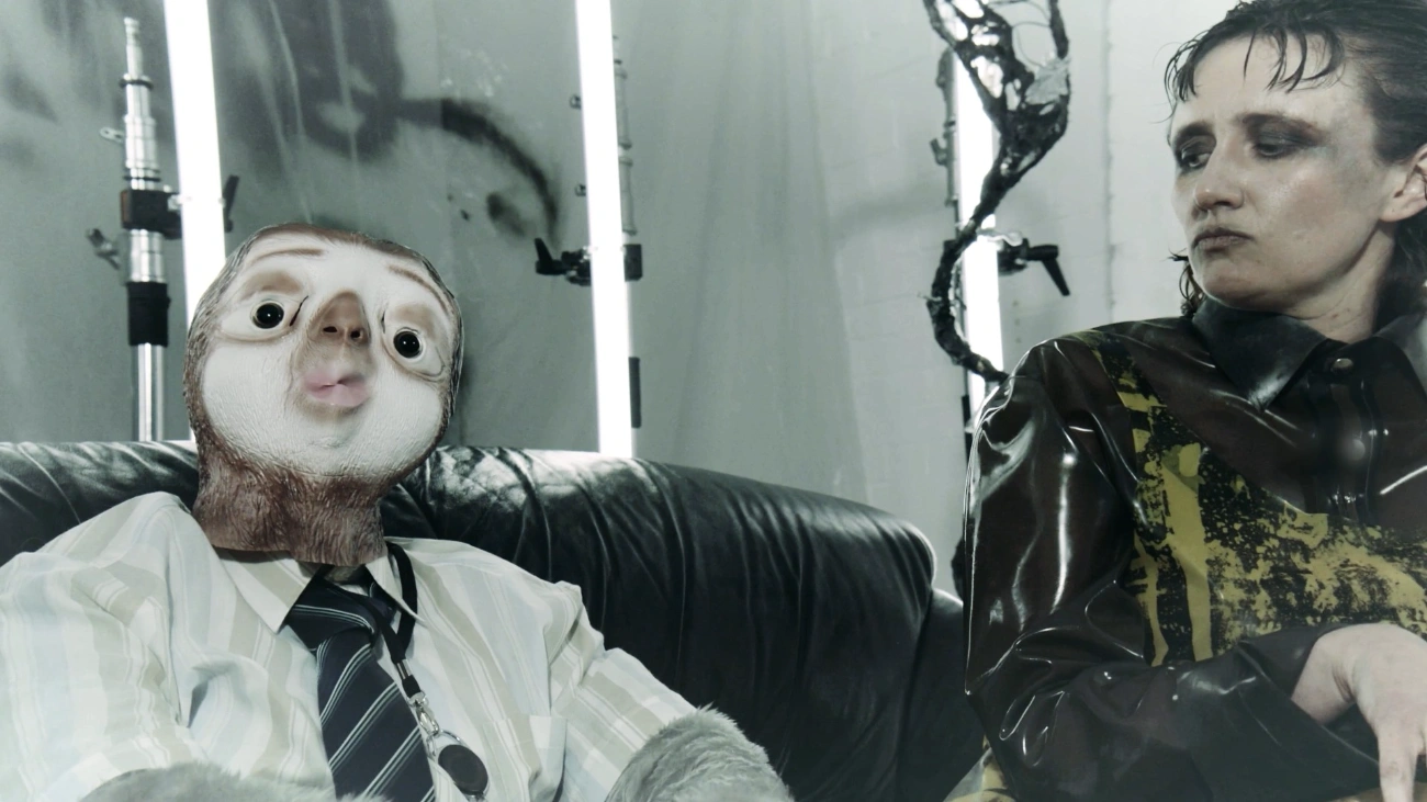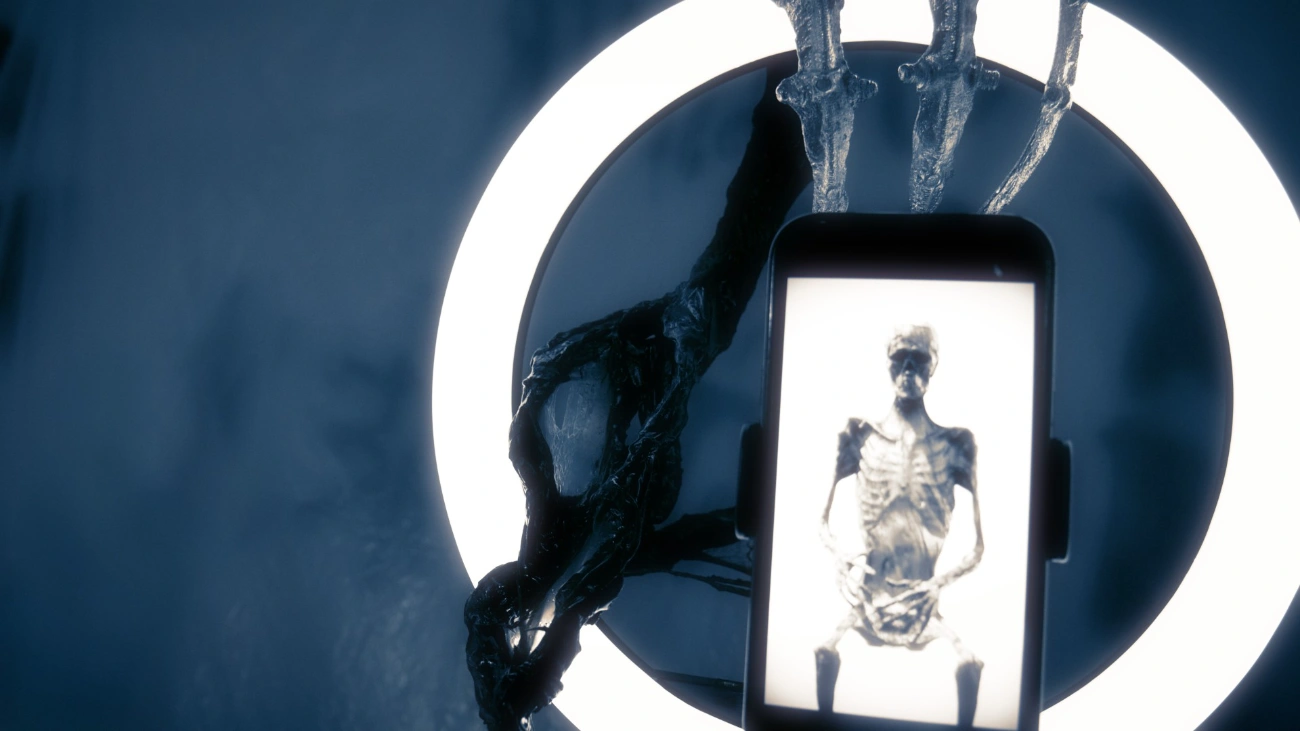 The narrative—if one should call it that—is a cycle of collapse. A bog-body skeleton trudges through a weather-blasted landscape, edging toward the mechanical replacement waiting in a cave: a robot in activewear with exposed gears and the weary poise of someone forced to tutorialize the singularity. “Submit to the singularity,” it instructs, before the image ruptures and the sound “of something unnecessary intensifies.” The film loops, as if insisting that the collapse is not a finale but a climate.