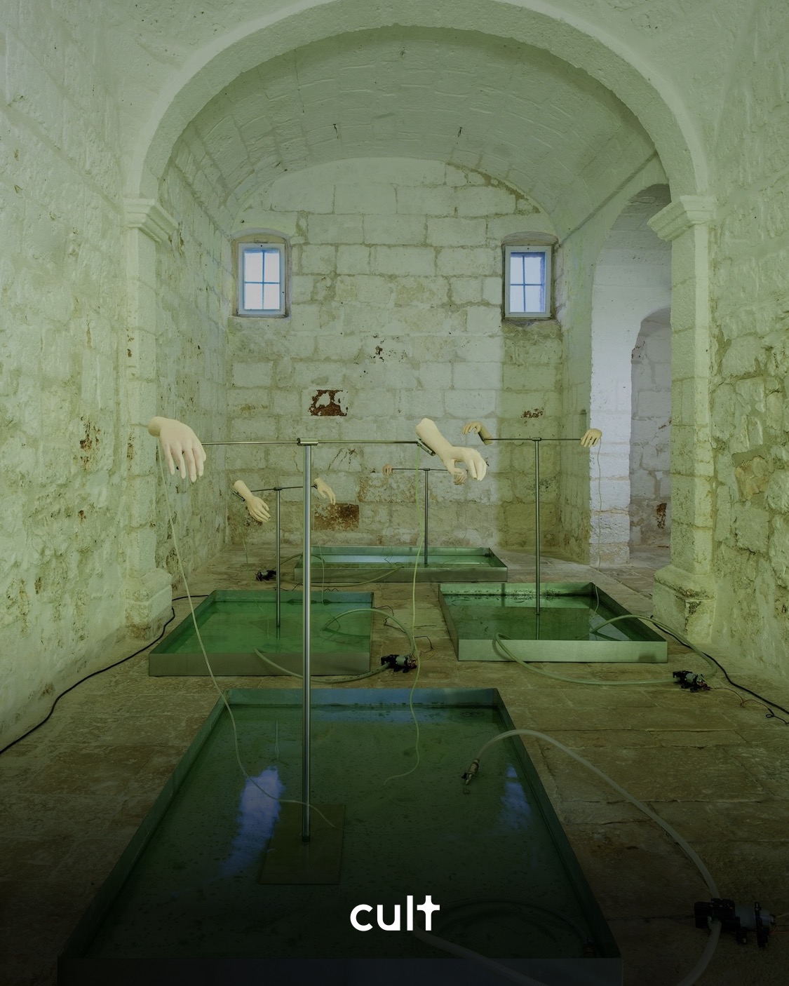 Water does not close systems; it opens them. This is the fundamental premise that animates Arianna Ladogana's installation within the Ex Chiesetta at Fondazione Pino Pascali in Polignano a Mare—a place where stone walls and vaulted ceilings have witnessed centuries of human ritual, and where now four sculptural bodies half-dissolve in tanks of perpetual liquefaction.