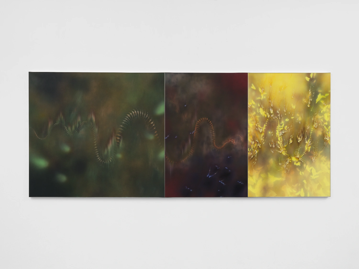 The dissolution continues in Metabolism (2025), where glowing snakes stretch across pale surfaces with an almost sacred resonance. Here, survival replaces menace, continuity replaces rupture. Bodies and technologies, matter and schemata, intertwine in quiet persistence. In Death needs no proof, it consumes it all (2025), Donzé returns to the threshold of the intangible. The work gestures toward what can never be fully designed: a form that is alive, fragile, and already vanishing.